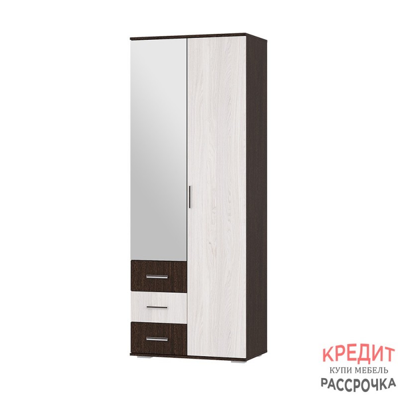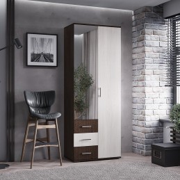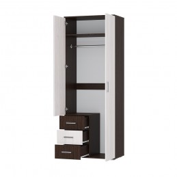 Двустворчатый шкаф "Белла" станет незаменимым помощником в хранении ваших вещей. Модель имеет отделение с хромированной штангой для одежды на вешалках, три выдвижных ящика для белья и аксессуаров, а также верхнюю полку. На один из фасадов прикреплено высокое зеркало.