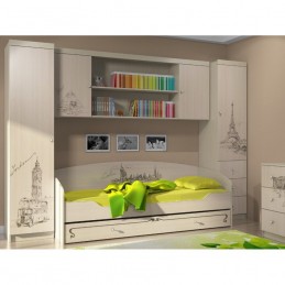 Все основные элементы набора: кровать, двустворчатый шкаф для одежды, стойка для личных вещей и большая навесная полка, компактно составлены вместе — их можно разместить вдоль одной стены, что позволяет сэкономить пространство в комнате.