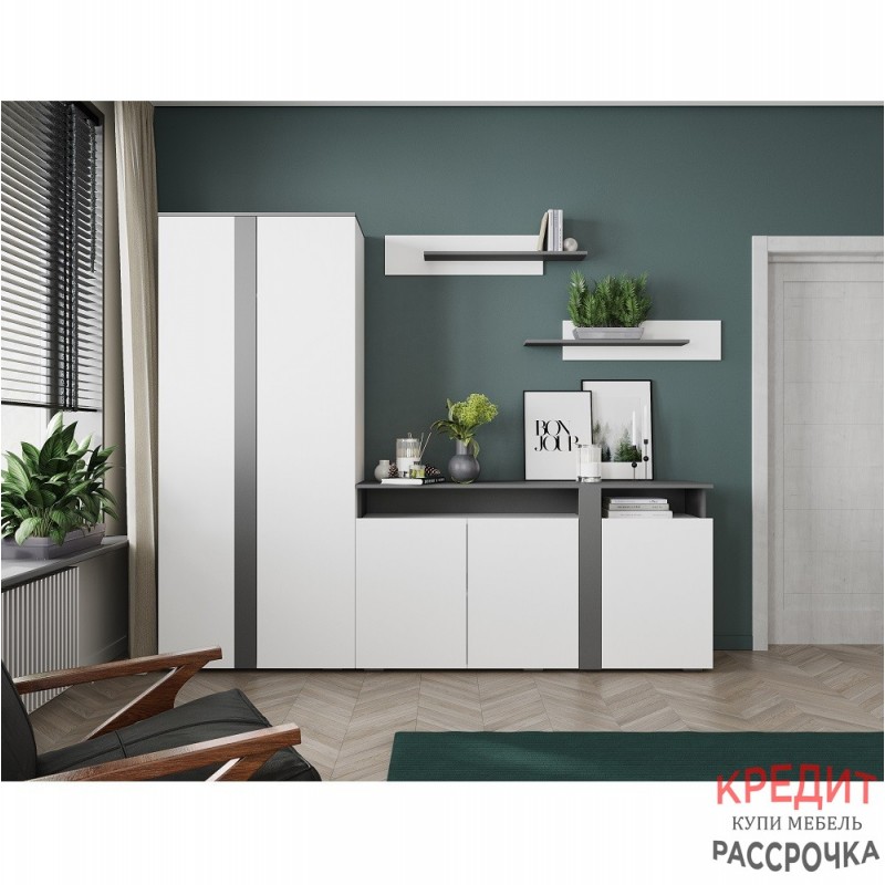 Особенности корпус ЛДСП белый с тиснением "древесные поры" фасад ЛДСП серый графит скошенные фасады отсутствие лицевой фурнитуры