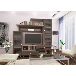 Фасады декорированы стеклом "лакобель" черного цвета. Использование такого элемента декора как стекло «лакобель» добавило в эту модель блеска и глянца и подчеркнуло её стиль. Без платяного шкафа эта модель становится ещё более компактной и и идеально подойдёт для небольшой гостиной.
