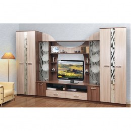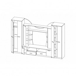 Стенка «Софи Н» – это эффектная мебель, состоящая из двух двустворчатых шкафов и центральной секции. Один из шкафов имеет внутри штангу для вешалок, а другой – вместительные прочные полки. Фасады украшаются нетривиальными вставками, сочетающими контрастные оттенки. В центральном отделе предусмотрены полки, ниши со стеклянными дверцами для красивой посуды, сувениров, выдвижные ящики и небольшие отделы с распашными глухими дверцами. Гостиная устанавливается на цоколь.