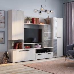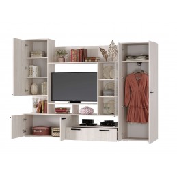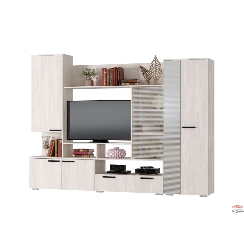 Гостиная "Денди" - грамотно продуманная система хранения оснащена закрытым двустворчатым шкафом, пеналом, зоной под ТВ, открытыми и закрытыми полками, на которых можно разместить домашнюю акустику, любимые книги или изящные статуэтки. С одной из сторон ТВ-зоны находятся три полки со стеклянной дверцей. Особый шарм ей придаёт пескоструйный декор в виде горизонтальных линий по всей площади поверхности. В едином стиле декорировано стекло, прилегающее к ближайшей створке распашного шкафа. Шкаф состоит из вместительной зоны выдвижной штангой для хранения платяных изделий и антресольной полки.
