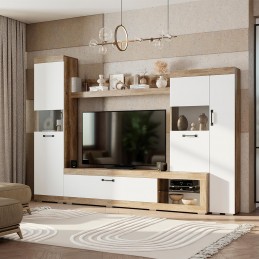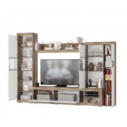 Современная гостиная «Тесла» – это надёжность, практичность и функциональность в интерьере дома, которые подчеркнут Ваше стремление ко всему новому и эксклюзивному. Корпус из ЛДСП цвета «дуб каньон» с эффектом натурального спила элитного сорта дуба, имеющего пористую текстуру с выделенной структурой древесных волокон идеально сочетается с однотонными фасадами из МДФ облачно белого цвета.