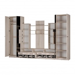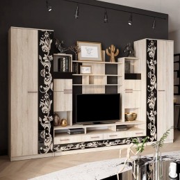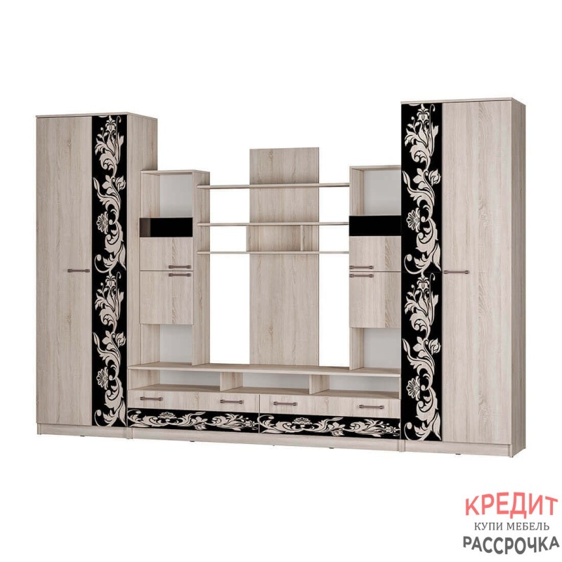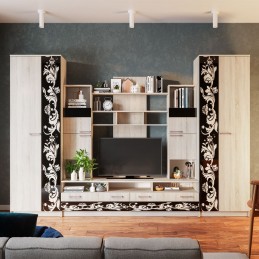Красивое готовое решение для вашей гостиной. Оптимальное количество полок для хранения и лаконичный дизайн – достоинства данной модели. Гостиная "Багира" не загромоздит вашу комнату, а аккуратно впишется в интерьер квартиры. Вставки из темного стекла с лаконичным цветочным орнаментом создают стильный акцент.