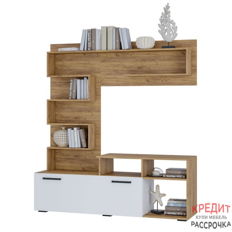 Функциональный и компактный гарнитур "Евро" прекрасно подойдёт для небольшой гостиной. Модель, ориентированная на удобство и простоту использования. оригинальные открытые полки, на которых можно разместить фотографии, предметы декора или любимые книги, представляют собой единую ломаную линию удобная зона под ТВ вместительная ниша, скрытая створкой в белом цвете.