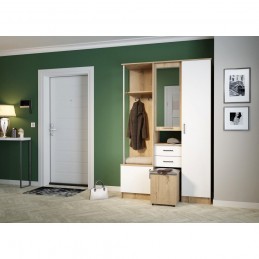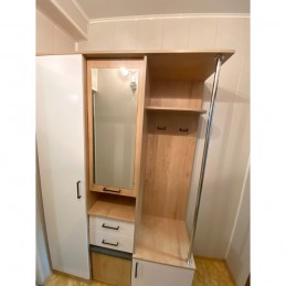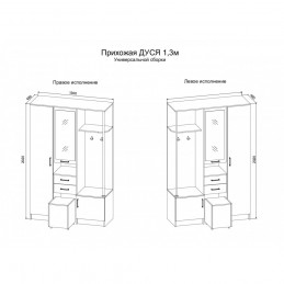 Гарнитур можно подобрать в соответствии с пожеланиями и предпочтениями потребителей. В комплекте помимо самой прихожей также поставляется и пуфик. Прихожая «Дуся» станет идеальным решением для небольших по площади помещений, ведь модульные элементы позволят расставить шкафчики для любой планировки.