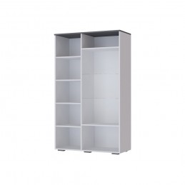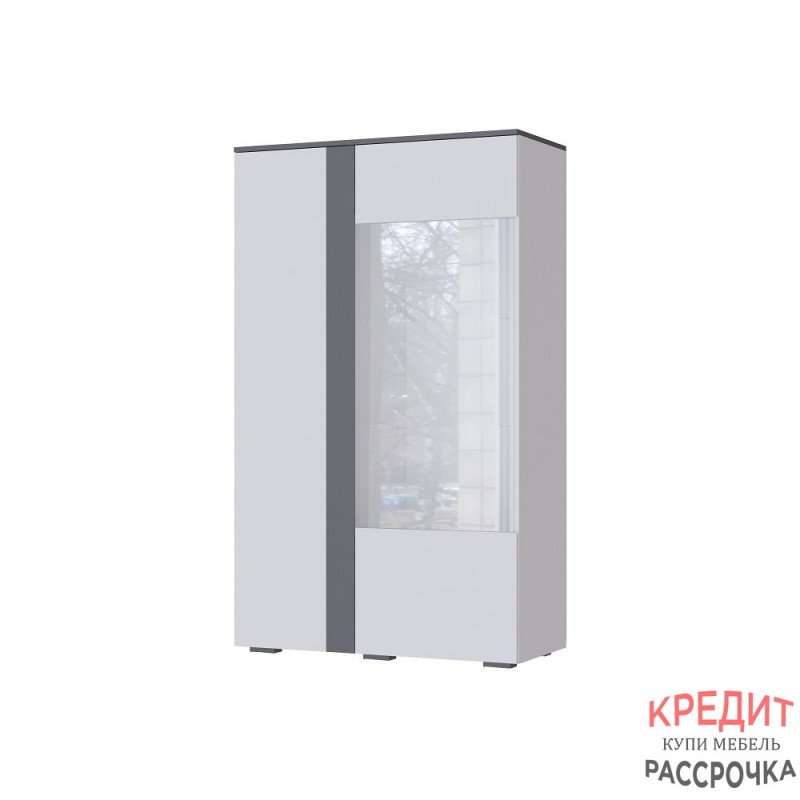 Особенности корпус ЛДСП белый с тиснением "древесные поры" фасад ЛДСП серый графит скошенный фасад наполнение - набор полок из ЛДСП и стекла