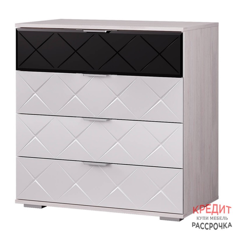 Комод "Кимберли" выделяется своим необычным дизайном, а именно черным фасадом верхнего ящика и стильными эргономичными ручками.