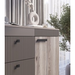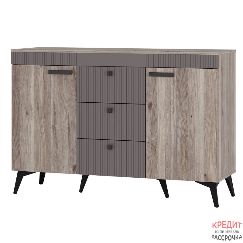 Комод «Кассандра» состоит из трёх вместительных зон: 2 боковые зоны с полками, а центральная состоит из трёх ящиков, в которых удобно хранить постельное бельё и мелочи.