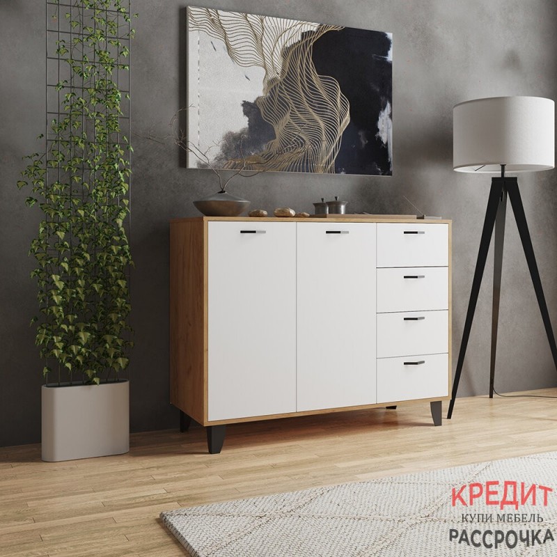 Комод Катрин-12 — это стильный и функциональный элемент интерьера, который станет отличным дополнением к вашей спальне или гостиной. Он выполнен в современном стиле и имеет комбинированную конструкцию, четыре выдвижных ящика и полки за распашными фасадами.
