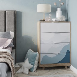 Особый шарм комодам «Мегаполис» придают трендовые цветовые решения фасадов, которые идеально вписываются практически в любой стиль. Оригинальная фрезеровка и эксклюзивная фотопечать выглядит очень эффектно и эксклюзивно. Пыли и грязи на таких поверхностях совершенно не видно, а это огромный плюс для домохозяек! Комод (КМ-02) состоит из четырёх выдвижных ящиков на шариковых направляющих для хранения одежды, пастельного белья и других хозяйственных аксессуаров. Цветовая палитра фасадов комодов впервые разбавлена фасадами с качественной фотопечатью.