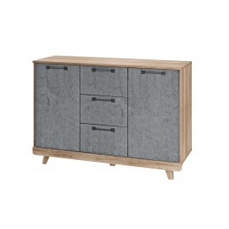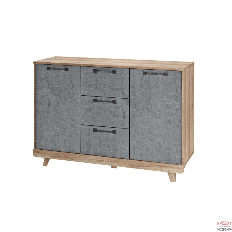 Комод (КМ-15) выдержан в общей стилистике «Мегаполис» и состоит из двух распашных по бокам и трёх выдвижных по центру вместительных ящиков на шариковых направляющих с удобной системой хранения. Полезное пространство распашных ящиков разделены полками.