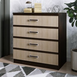 Комод является частью модульной коллекции "Сакура". Его можно поставить как в прихожую, так и в спальню, детскую или гостиную. Модель состоит из четырех выдвижных ящиков, каждый из которых имеет светлый фасад и эргономичную ручку с хромированной отделкой.
