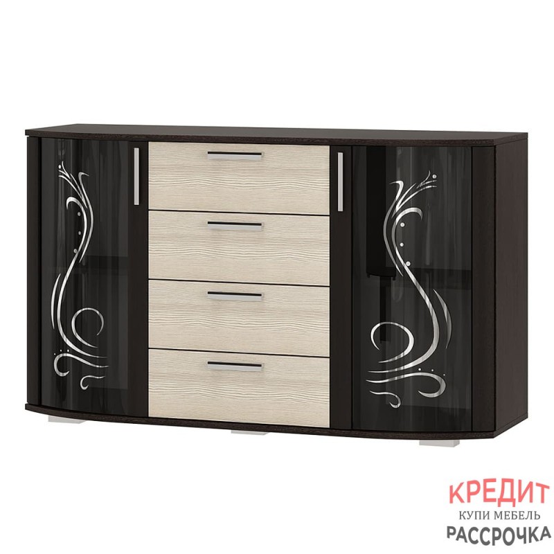Комод "Грация" может стать центром внимания любой комнаты в вашей квартире или доме. Помимо четырех выдвижных ящиков, с обеих сторон модель оснащена двумя распашными стеклянными створками, за которыми расположены полки для хранения вещей. На столешнице комода Грация можно разместить фотографии или, например, вазу с цветами. Светлые фасады выдвижных ящиков цвета лоредо прекрасно сочетаются с орнаментом на тонированных стеклянных дверцах.