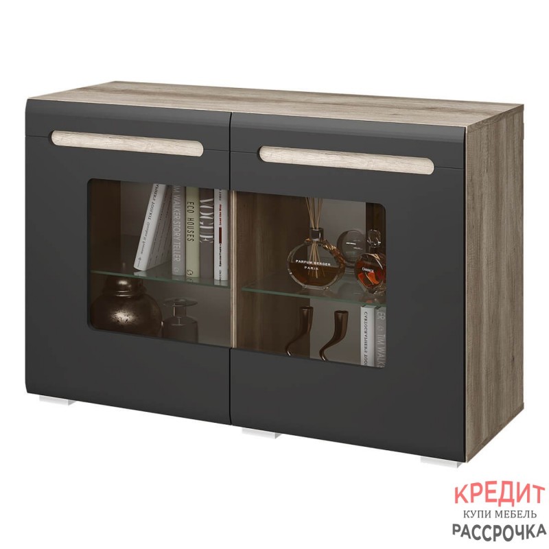 Большой комод "Наоми", выполненный в цвете "дуб каньон" с темными фасадами, может стать привлекательным акцентом любой комнаты. За двумя распашными дверцами, в которые встроены тонированные стекла, расположены полки для хранения посуды или сувениров. А в верхние выдвижные ящики можно положить какие-то мелочи, аксессуары или документы.