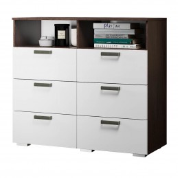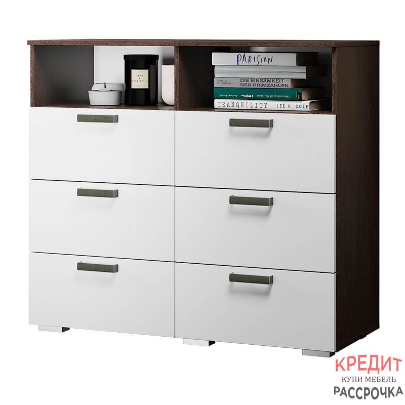 • комод выделяется белыми глянцевыми фасадами и эргономичными хромированными ручками на фоне корпуса в цвете "венге".