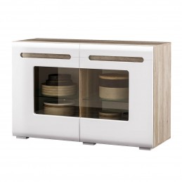 Большой комод "Наоми", выполненный в цвете "дуб каньон" с белыми фасадами, может стать привлекательным акцентом любой комнаты. За двумя распашными дверцами, в которые встроены тонированные стекла, расположены полки для хранения посуды или сувениров. А в верхние выдвижные ящики можно положить какие-то мелочи, аксессуары или документы.