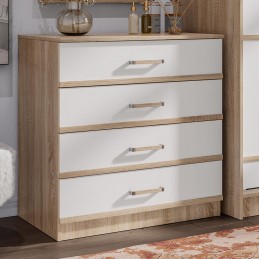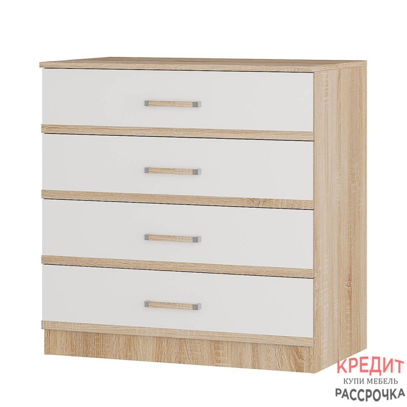 Комод является частью модульной коллекции "Сакура". Его можно поставить как в прихожую, так и в спальню, детскую или гостиную. Модель состоит из четырех выдвижных ящиков, каждый из которых имеет светлый фасад и эргономичную ручку с хромированной отделкой.