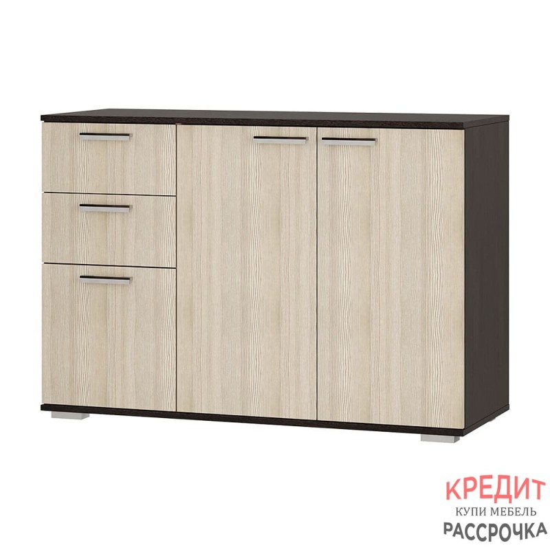 Комод «Стандарт № 3» имеет необычное размещение полок и ящиков. Основная часть изделия состоит из двух распашных дверок, за которыми находятся места для хранения вещей. Левая часть комода представляет собой два выдвижных ящика и нижнюю секцию также с распашной дверцей и полками.