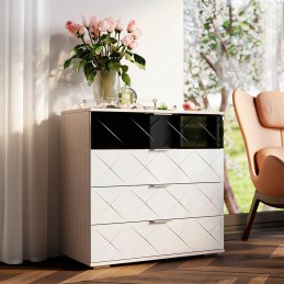 Комод "Кимберли" выделяется своим необычным дизайном, а именно черным фасадом верхнего ящика и стильными эргономичными ручками.