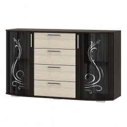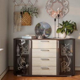 Комод "Грация" может стать центром внимания любой комнаты в вашей квартире или доме. Помимо четырех выдвижных ящиков, с обеих сторон модель оснащена двумя распашными стеклянными створками, за которыми расположены полки для хранения вещей. На столешнице комода Грация можно разместить фотографии или, например, вазу с цветами. Светлые фасады выдвижных ящиков цвета лоредо прекрасно сочетаются с орнаментом на тонированных стеклянных дверцах.