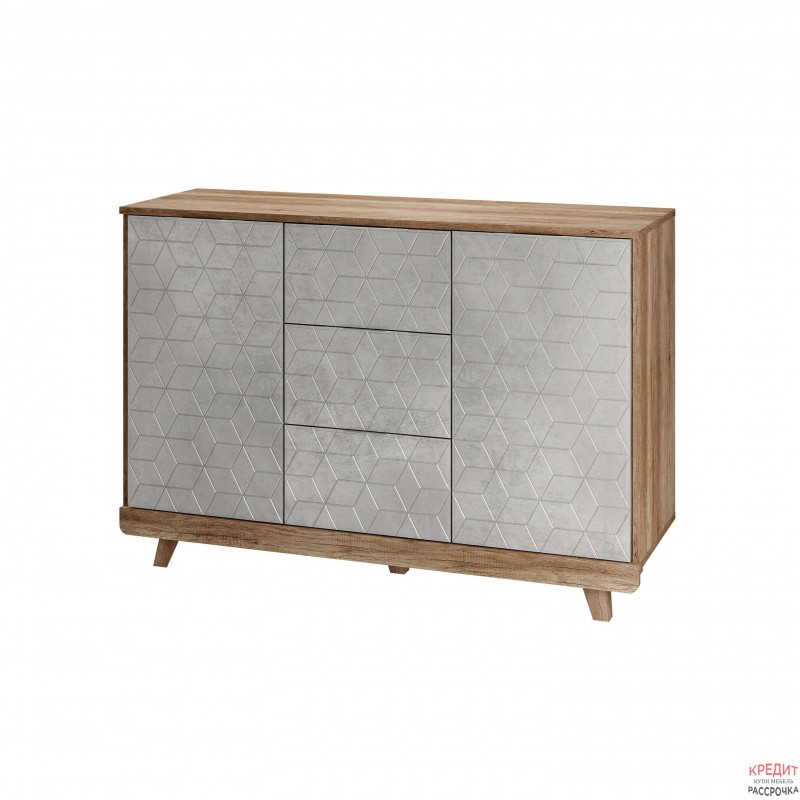 Комод (КМ-15) выдержан в общей стилистике «Мегаполис» и состоит из двух распашных по бокам и трёх выдвижных по центру вместительных ящиков на шариковых направляющих с удобной системой хранения. Полезное пространство распашных ящиков разделены полками.