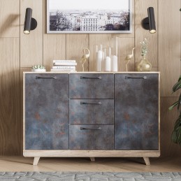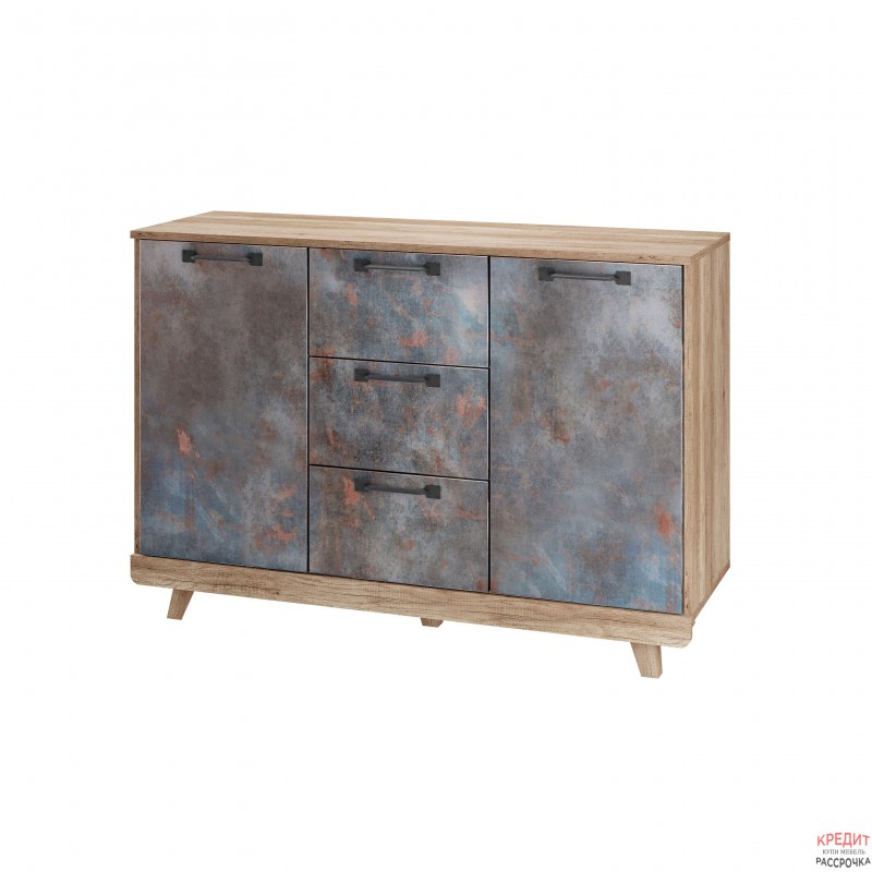 Комод (КМ-15) выдержан в общей стилистике «Мегаполис» и состоит из двух распашных по бокам и трёх выдвижных по центру вместительных ящиков на шариковых направляющих с удобной системой хранения. Полезное пространство распашных ящиков разделены полками.