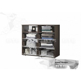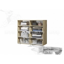 Комод имеет выдвижные элементы для одежды, белья или аксессуаров. Верхняя поверхность имеет открытую нишу над корпусом, которая удобна для хранения нужных под рукой предметов. А на самой верхней полке можно поставить дорогие сердцу фотографии или оригинальные аксессуары.