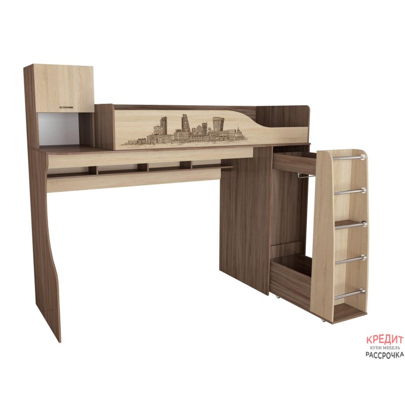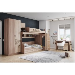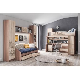 - Широкий выбор модулей: функциональные кровать-чердак и односпальная кровать, прикроватная тумба, разнообразие вместительных шкафов, угловое завершение, комод, навесная секция, письменный стол и стол с надстройкой.