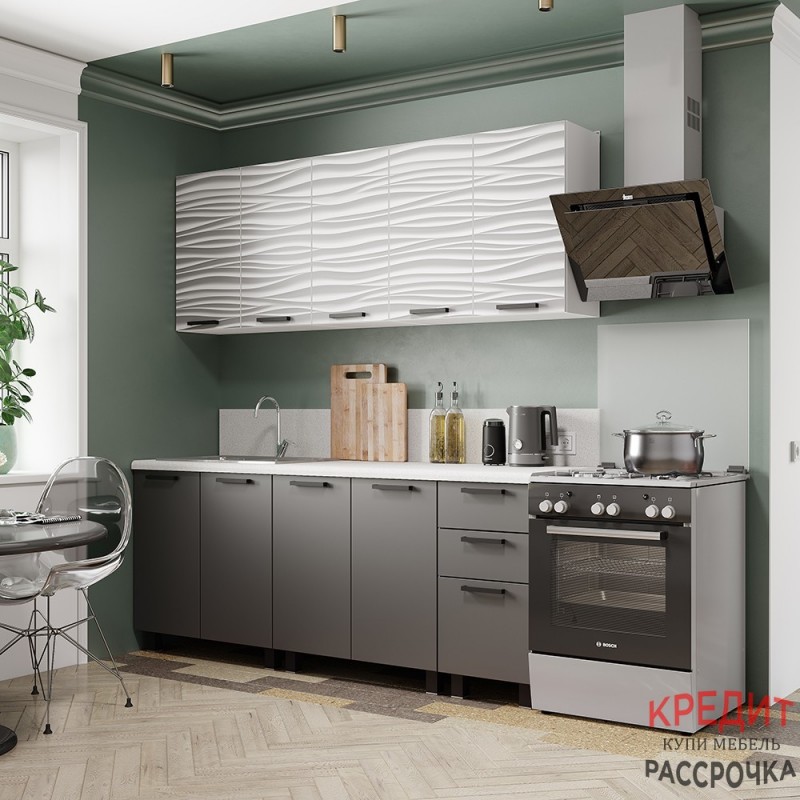 Сочетание холодного серого с теплым коричневым цветом нижних фасадов выглядит по-домашнему уютно и гармонично.