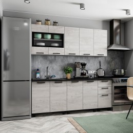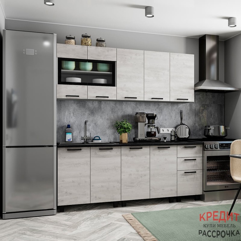 Стильная кухня, выполненная в модном декоре "бетон пайн", удачно вписывается в городской индустриальный стиль и выглядит очень необычно и оригинально. Отличительная черта цвета в сочетании светлой бетонной поверхности, визуально расширяющей пространство, и состаренной древесины. Кухня с лёгкостью впишется в любой эклектичный интерьер.