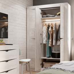 Спальный гарнитур «Леонардо» прекрасно впишется в любой современный интерьер. В комплекте есть всё необходимое для обустройства пространства: широкая кровать и коллекция модулей для хранения одежды, аксессуаров и постельных принадлежностей. Лофтовое цветовое решение корпусов и фасадов – настоящий тренд нашего времени – Бетон пайн светлый. Простой и выразительный, продуманный и небрежный, функциональный и непритязательный – он создаёт атмосферу уличного искусства, а текстура старого дерева добавляет декору индивидуальности.
