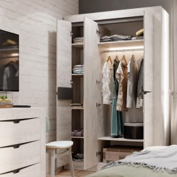 Трёхстворчатый распашной шкаф «Леонардо» с одной стороны имеет пять вместительных полок для белья, с другой стороны – удобную антресольную полку для хранения головных уборов, горизонтальную хромированную штангу для плечиков и нижнюю полку, в которой удобно хранить коробки с обувью. Особый шарм ему придаёт зеркало в полный рост, которое располагается на фасаде центральной створки.