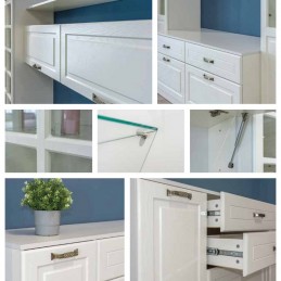 Ручки металл, цвет «старая бронза». Распашные двери на четырех шарнирных петлях. Горизонтальные откидные двери на газлифтах. Выдвижные ящики на шариковых направляющих.