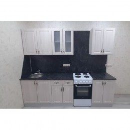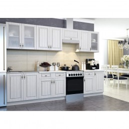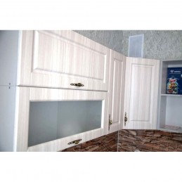 Фасады имеют резную отделку в форме прямоугольных контуров, которые придают им элегантность и свежесть. Все кромки облицовки закрыты пленкой ПВХ, защищающей ламинированную поверхность. Для сборки модулей использовался качественный материал, который позволяет недорогому кухонному гарнитуру сохранить первозданный внешний вид на протяжении длительного периода времени.