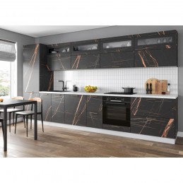 Все элементы кухонного гарнитура «Ройс» выполнены в минималистичных вариациях. За счет данной особенности рабочая зона является практически пустой и открытой для воплощения различных кулинарных задумок. Приятная слегка матовая на ощупь поверхность не требует максимальных усилий для ее уборки.