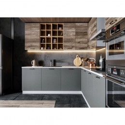 Все элементы кухонного гарнитура «Ройс» выполнены в минималистичных вариациях. За счет данной особенности рабочая зона является практически пустой и открытой для воплощения различных кулинарных задумок. Приятная слегка матовая на ощупь поверхность не требует максимальных усилий для ее уборки.