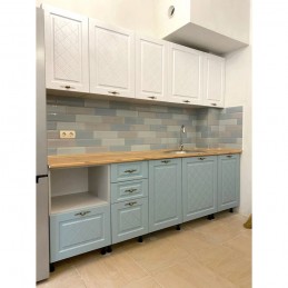 Модули на регулируемых пластиковых ножках, цоколь белого цвета. При необходимости верхние фасады можно сочетать одним цветом, нижние другим. Нижние модули не поставляются вместе со столешницей. В производстве гарнитура использованы безопасные материалы, которые не выделяют опасных веществ и безвредны для здоровья людей.