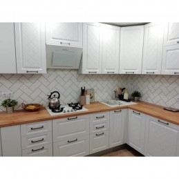 Модули на регулируемых пластиковых ножках, цоколь белого цвета. При необходимости верхние фасады можно сочетать одним цветом, нижние другим. Нижние модули не поставляются вместе со столешницей. В производстве гарнитура использованы безопасные материалы, которые не выделяют опасных веществ и безвредны для здоровья людей.