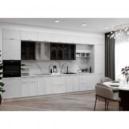 Кухонный гарнитур «Квадро» — удачное воплощение скандинавского стиля, прекрасно адаптированное к вкусам современных хозяек. Открытые полки и подвесные шкафчики с остеклением вносят в облик кухонного гарнитура нотки легкости и воздушности.