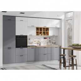Все элементы кухонного гарнитура «Ройс» выполнены в минималистичных вариациях. За счет данной особенности рабочая зона является практически пустой и открытой для воплощения различных кулинарных задумок. Приятная слегка матовая на ощупь поверхность не требует максимальных усилий для ее уборки.