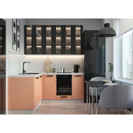 Все элементы кухонного гарнитура «Ройс» выполнены в минималистичных вариациях. За счет данной особенности рабочая зона является практически пустой и открытой для воплощения различных кулинарных задумок. Приятная слегка матовая на ощупь поверхность не требует максимальных усилий для ее уборки.