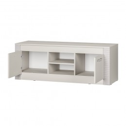 Стильная и лаконичная тумба под ТВ "Монако" станет украшением вашей гостиной. Модель выполнена в едином стиле с другими модулями мебельной коллекции Монако. Она изготовлена из высококачественной ЛДСП цвета "кашемир" и имеет декоративную отделку фасадов из МДФ. Изделие состоит из двух центральных открытых ниш, а также полок, спрятанных за распашными дверцами. На столешнице вы сможете разместить телевизор, а в зонах хранения – необходимые вещи и технику.