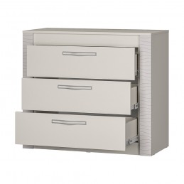 Комод "Монако" выполнен в сдержанном и элегантном стиле, как и все модели из одноименной мебельной коллекции. Изделие изготовлено в светлом цвете "кашемир" из качественной ЛДСП и имеет декоративные вставки из МДФ. Расположить все необходимые вещи можно в трех выдвижных ящиках, дополненных эргономичными ручками.