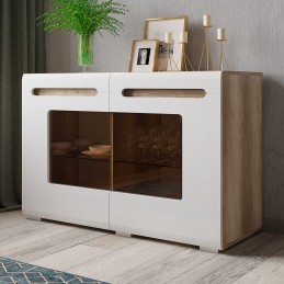 Большой комод "Наоми", выполненный в цвете "дуб каньон" с белыми фасадами, может стать привлекательным акцентом любой комнаты. За двумя распашными дверцами, в которые встроены тонированные стекла, расположены полки для хранения посуды или сувениров. А в верхние выдвижные ящики можно положить какие-то мелочи, аксессуары или документы.