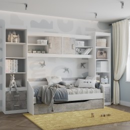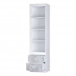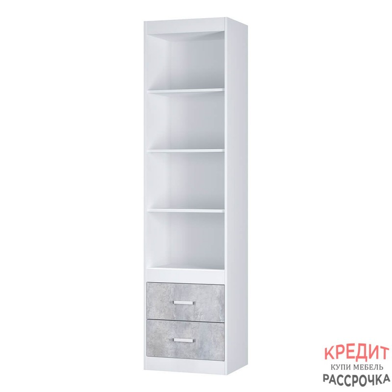 Модель открытого шкафа "Паскаль" состоит из нескольких открытых полок и двух закрытых ящиков. изделие изготовлено из высококачественной ЛДСП в комбинации двух светлых цветов "белый" и "цемент светлый", шкаф можно использовать для хранения книг, игрушек, канцелярских принадлежностей или же вещей.