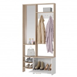 Компактная прихожая "Тео" – готовое решение для современной малогабаритной прихожей. Здесь есть все составляющие – зеркало с полкой для разных полезных мелочей, верхняя полка для головных уборов, просторная зона с крючками для верхней одежды, нижние открытые и закрытые полки, в которых можно хранить сезонную обувь. Регулируемые опоры позволяют установить прихожую на любой неровной поверхности.