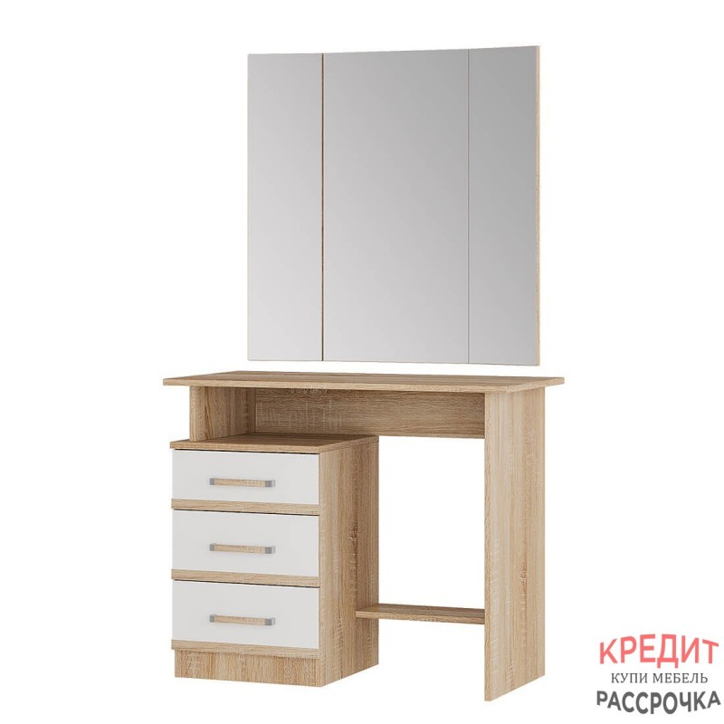 Лаконичный косметический стол Сакура выполнен в сочетании цветов сонома и белый. Модель состоит из большого зеркала со складывающимися боковыми створками и тумбы с тремя выдвижными ящиками. Стол позволит разместить все необходимые предметы личной гигиены, косметические средства или украшения. Красивое и практичное решение по лучшей цене — это косметический стол Сакура в компании «Семья Мебелони».