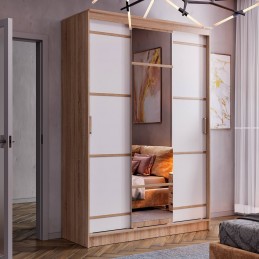Шкаф-купе "Сакура" выполнен в едином стиле с остальными модулями одноимённой мебельной серии. Он сделан из ЛДСП высокого качества в комбинации цветов "сонома" и "белый", раздвижные дверцы декорированы темными полосами и дополнены удобными ручками, центральная створка – полностью зеркальная. Внутри модель содержит все необходимые зоны для хранения одежды и обуви: большое отделение для плечиков, а также полки и ниши для остальных вещей.