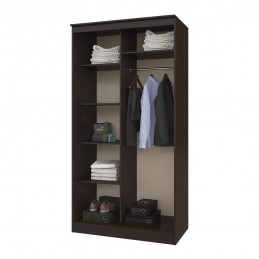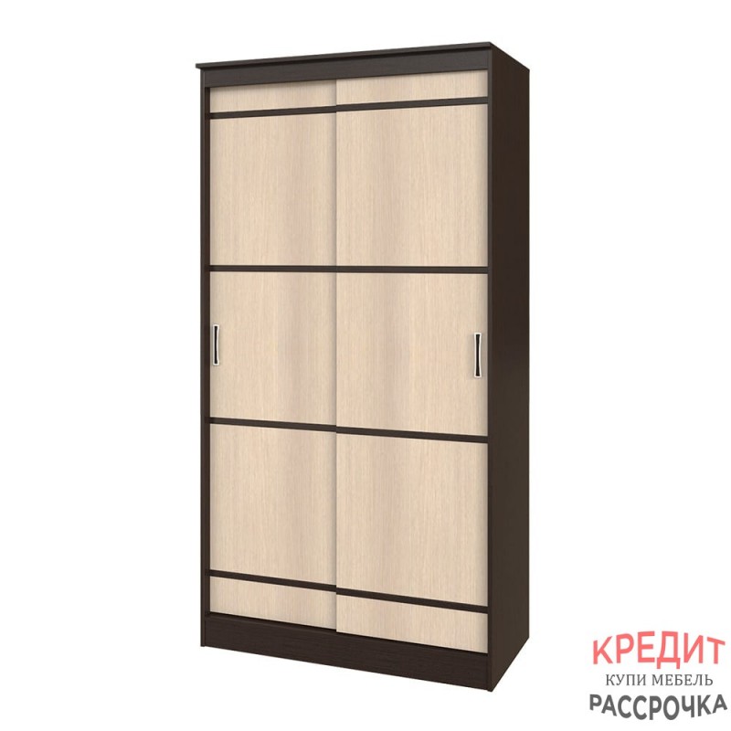 Шкаф-купе "Сакура" выполнен в едином стиле с остальными модулями одноимённой мебельной серии. Он сделан из ЛДСП высокого качества в комбинации цветов "венге" и "лоредо", раздвижные дверцы декорированы темными полосами и дополнены удобными ручками. Внутри модель содержит все необходимые зоны для хранения одежды и обуви: отделение для плечиков, а также полки и ниши для остальных вещей.